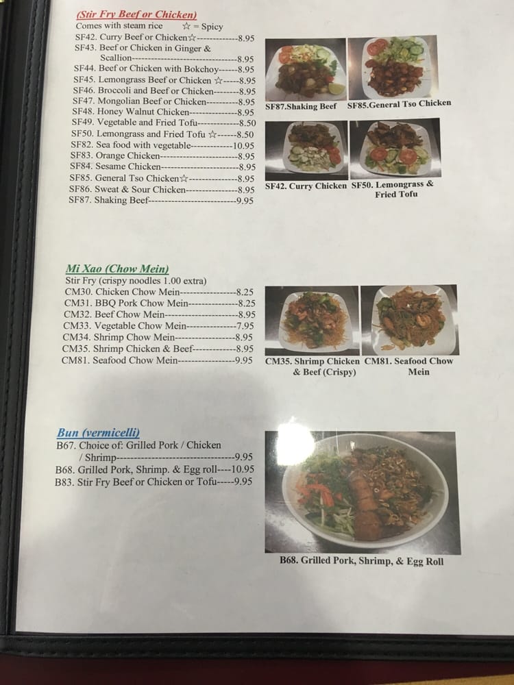 Shaking beef, choice of chow mein, fried rice, or steamed white rice.
